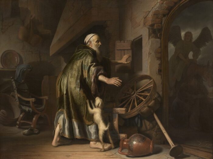The Angel Departing from the Family of Tobias, 1641. Rembrandt van Rijn expand_more.. In the Bible, just father and son are present at the leave-taking, but Rembrandt assembled the entire household, displaying his fondness for down-to-earth domesticity. Also taking leave is Tobias's dog, said to be the only dog given a specific role in the.